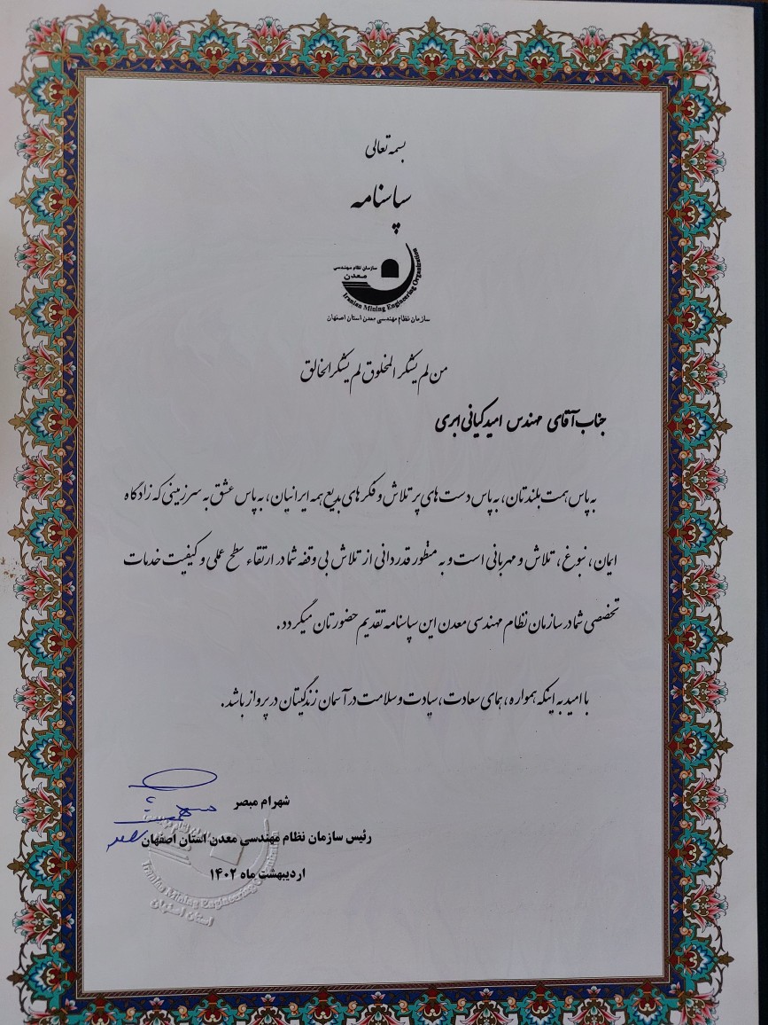 دعوت به مراسم در جمع فرهیختگان ، دانشمندان و اساتید اعضای هیئت علمی برتر کشور و همچنین پیشکسوتان معدن صنایع معدنی از سوی سازمان نظام مهندسی معدن ایران در اصفهان افتخاریست که از اندیشه ی زلال آن فرهیختگان در مسیر ترویج علم و فناوری های نو سرچشمه میگیرد.
